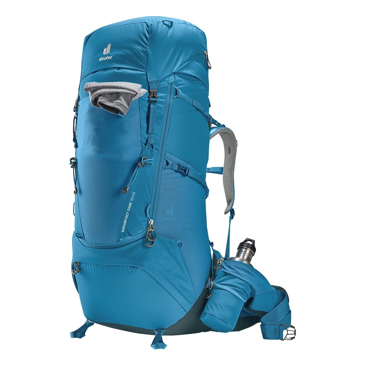Deuter Aircontact Core 70+10 Trekking Çantası, Air Spacer file ve geniş havalandırma kanalı ile Deuter Aircontact sırt sistemi, ayrıca ActiveFit omuz askıları ve ayarlanabilir göğüs askısı sayesinde rahat bir taşıma sağlar. Kalçaları saran hareketli bel desteği ve Deuter’in ergonomik yamuk şeklindeki bel yastığı ile birlikte Y şeklindeki çerçeve, yükü etkili bir şekilde dağıtmak ve dengelemek için birleşir. Tam boyutlu, önündeki J şeklindeki fermuarı ön bölümdeki eşyalarınıza kolayca ulaşmanızı sağlar. Geniş, ayrılabilir bel desteği cepleri ekstra saklama alanı sağlarken ve eşyalarınızı ulaşılabilir kılar. Ayrıca fermuarlı 1.5 litrelik şişe tutucu da siz hareket halindeyken her an elinizin altında bulunur.